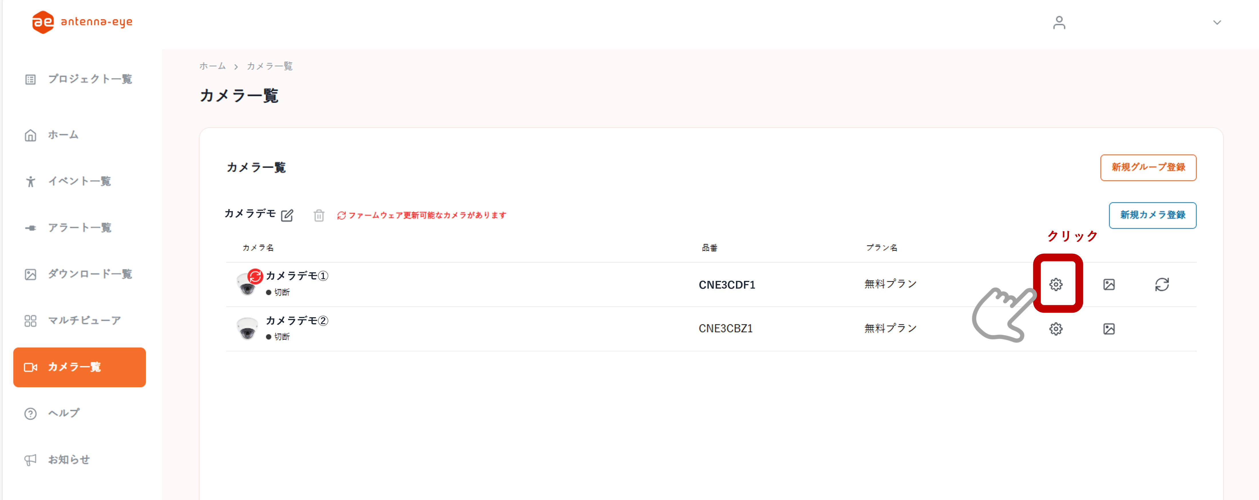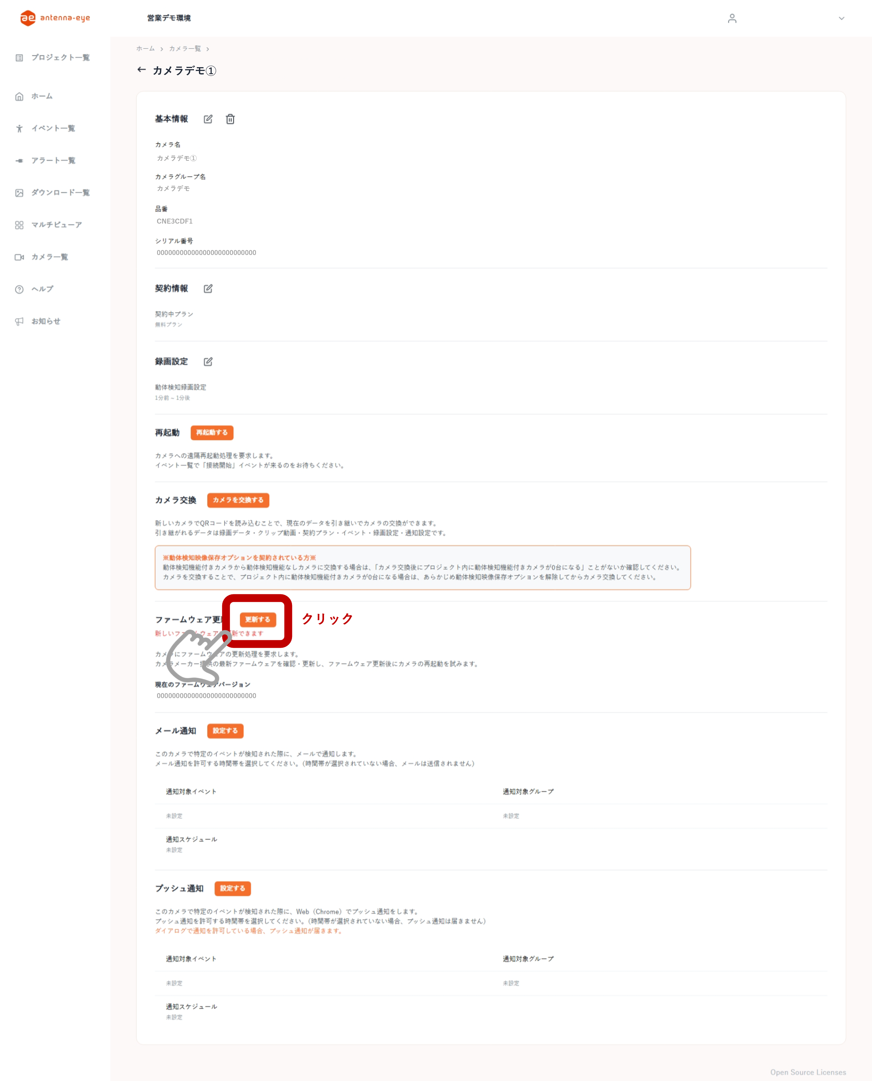 アップデートには、Antenna-eyeウェブアプリケーションのカメラ一覧からカメラ設定を開き、『ファームウェア更新』グループ内の『更新する』ボタンを押してください。