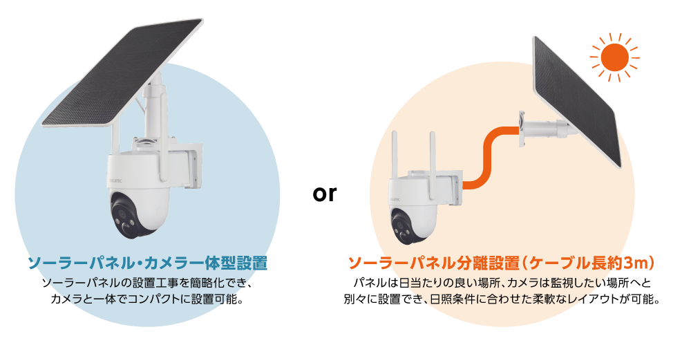 ソーラーパネル一体型で省スペースかつ工事を簡略化して設置可能。さらに、ケーブル長約3mの分離設置にも対応し、カメラは監視したい場所、パネルは日当たりの良い場所といった柔軟なレイアウトが行えます。