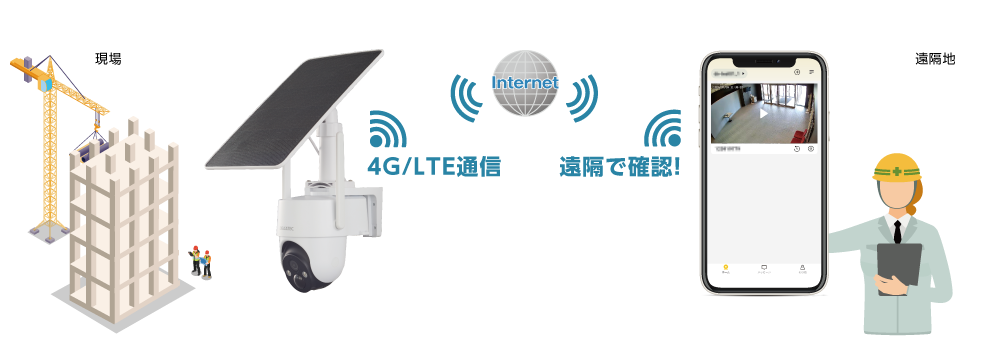 LTE(4G)通信※1に対応しているため、ネットワーク配線工事が不要。仮設や期間限定の現場でも、必要な期間だけ設置・撤去ができ、柔軟かつ運用しやすい監視環境を実現。建設・工事現場のセキュリティ(防犯)対策や進捗確認にも最適です。