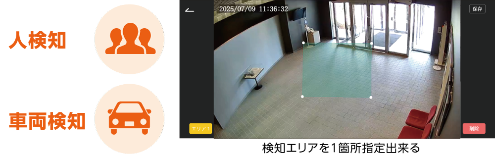 AI画像認識で「人」「車」を特定して検出し、画面上に検知枠で表示。監視したいエリアを1か所指定でき、人感センサーや単純な動体検知より高精度な通知が可能です。誤検知や不要な通知を抑えつつ、不審者・車両の侵入、盗難・いたずらの抑止と事後証拠の確保に貢献します。