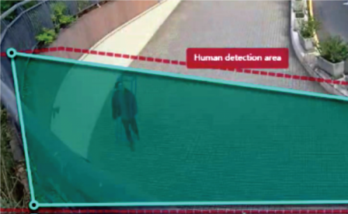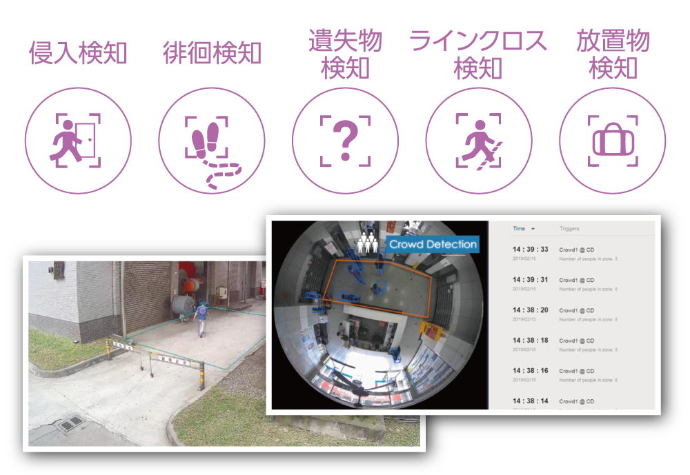 人物の行動をAIが自動分析することで、侵入や徘徊の検知、指定したラインの越境など5つの項目を検知することが可能。